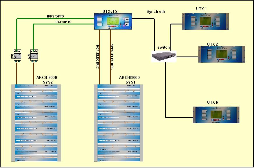 UTXvTS może być wykorzystany jednocześnie do: synchronizacji urządzeń serii UTX poprzez ethernet oraz do synchronizacji systemu rejestracji Archi9000. Błąd synchronizacji rejestracji w systemie Archi9000 z wykorzystaniem UTXvTS wynosi <25us.