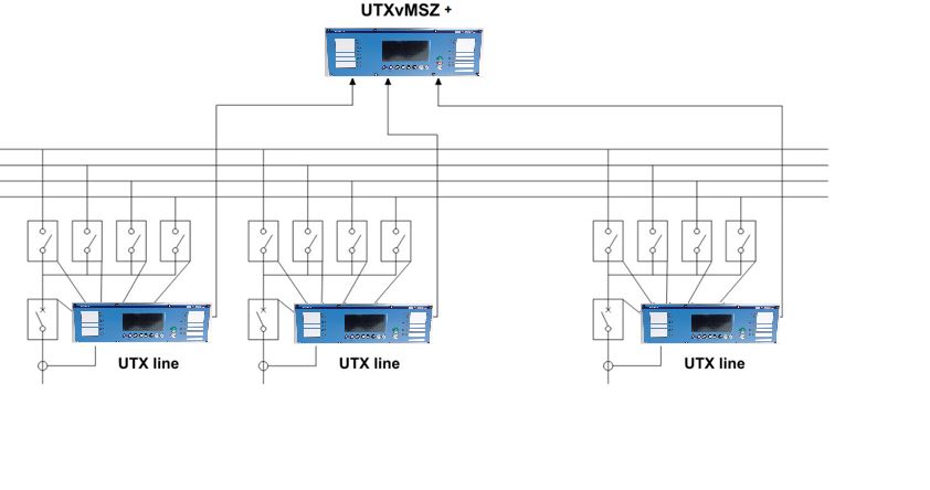 Uniwersalne, programowalne ( nie dedykowane! ) nastawy pól pozwalają na wykonanie praktycznie dowolnej konfiguracji 4 szynowej. Zabezpieczenie odczytuje prądy fazowe oraz stan terminala polowego z urządzeń w polach. Komunikacja ze skojarzonymi urządzeniami odbywa się poprzez dedykowany interfejs światłowodowy AAbus oraz standardowo może również komunikować się poprzez lokalną sieć ethernetową AoE. Wyłączenia wykonywane są z wykorzystaniem obwodów wyłączających skojarzonych urządzeń poprzez interfejs Aabus. Zabezpieczenie UTXvMSZ+(LRW) może być wykonane w wersji skupionej poprzez zamontowanie w jednej szafie mastera oraz slave-ów µUTX3vL/SSZ jako dedykowanych akwizytorów do zabezpieczenia szyn zbiorczych i automatyki LRW.